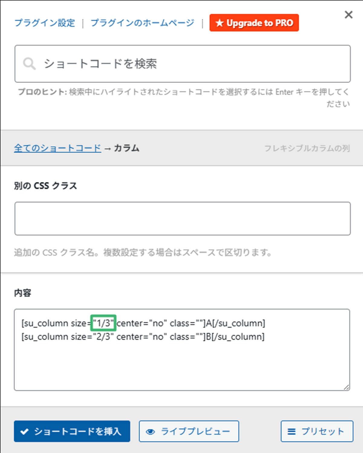 するとショートコードcolumnsの設定画面が出て来て、サンプルコードが表示されることになるw